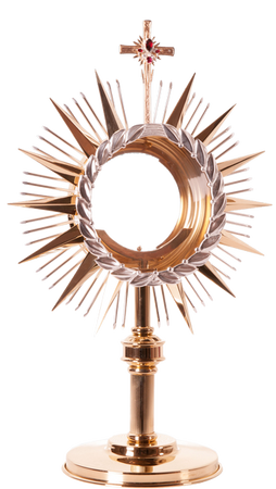 Duża monstrancja, pozłacana i posrebrzana z melchizedkiem i futerałem w zestawie o wysokości 73 cm