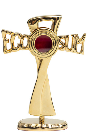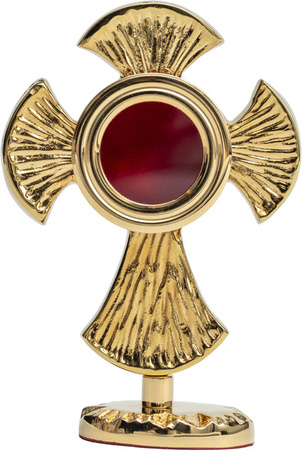 Relikwiarz mosiężny złocony z krzyżem papieskim z podwójnym płomieniem,na jedną relikwię o wysokości 20 cm