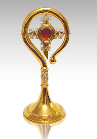 Duży relikwiarz mosiężny złocony w formie pastorału zdobiony srebrem i rubinami o wysokości 37 cm