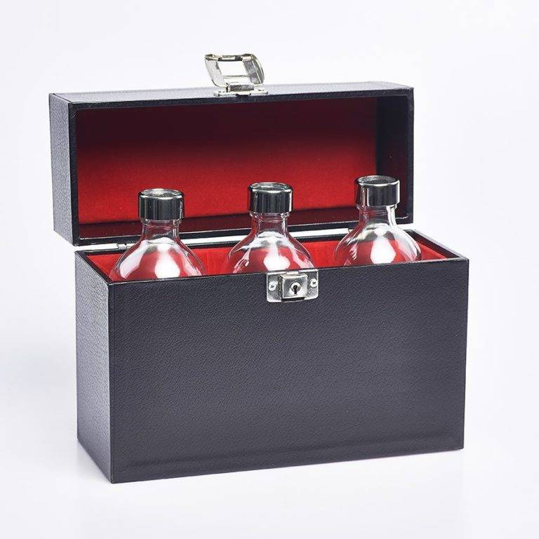 Zestaw potrójny butelek na oleje święte INF, CAT, CHR, w drewnianym etui.