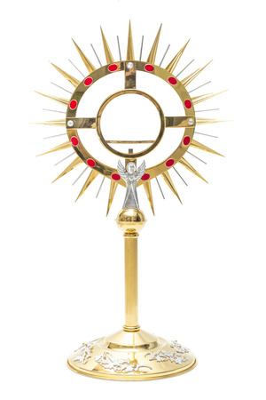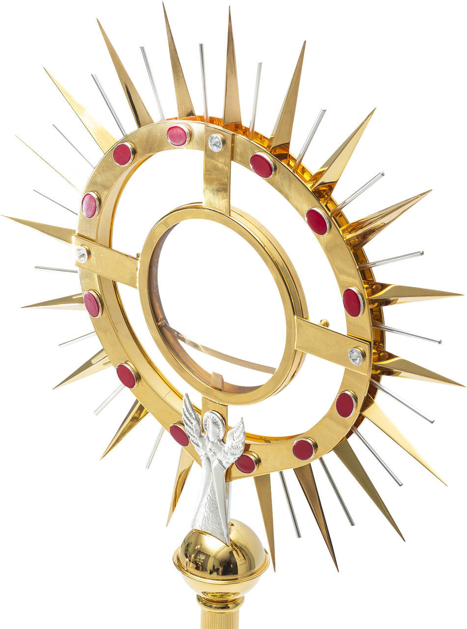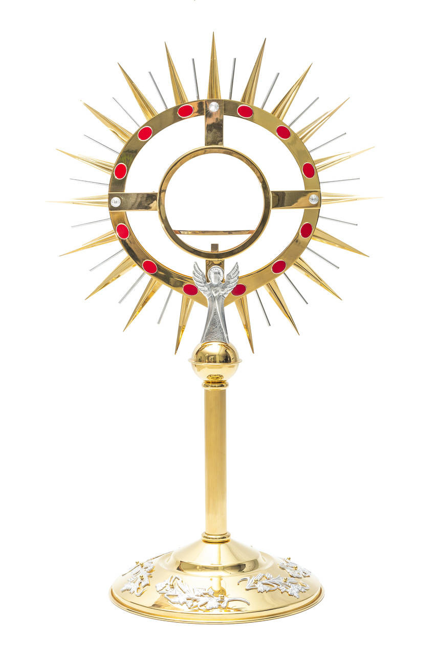 Duża monstrancja zdobiona kamieniami ,mosiężnymi, złoconymi i srebrzonymi elementami.