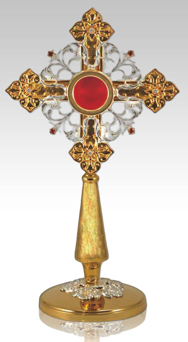 - Duży relikwiarz mosiężny złocony w formie krzyża zdobiony srebrem i rubinami na jedną relikwię o wysokości 40 cm