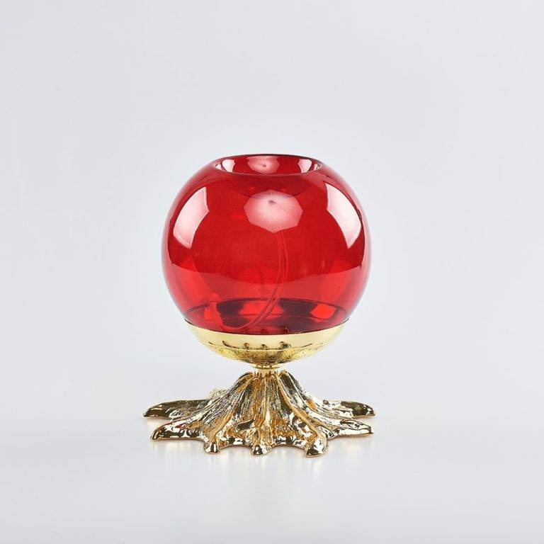 - Pojemnik na olej z czerwonego szkła w kształcie kuli.