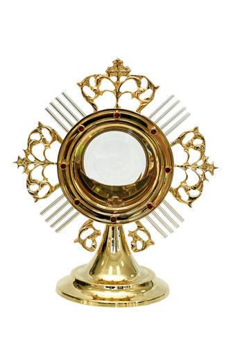Mała monstrancja złococna i srebrzona, zdobiona oryginalną metaloplastyką. W zestawie melchizedek, dedeykowana do hostii o średnicy 7 cm. Monstrancja została wykonana z niezwykłą starannością. Zawiera liczne zdobienia i przetłoczenia, a także został poddana polerowaniu.