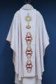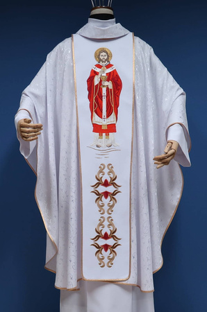 - Ornat czerwony z tkaniny żakardowej, obszyty złotą lamówką, kołnierz typu golf. Pas zdobiony aplikacją i haftem maszynowym z tkaniny typu elana, luźno wszyty w podkrój szaty. W komplecie stuła w całości uszyta z tej samej tkaniny co ornat, o długości 125
