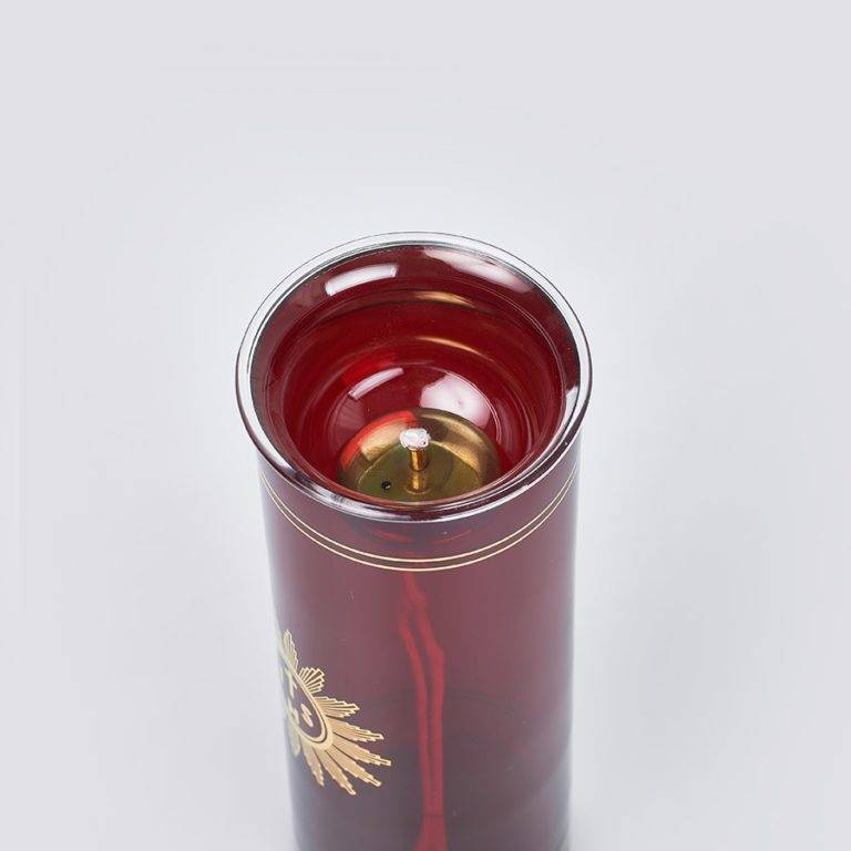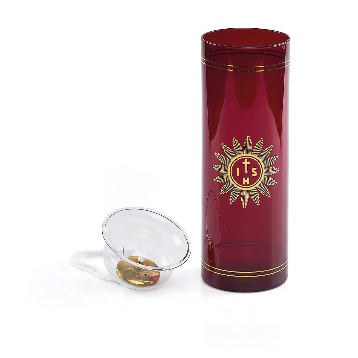 - Tuba wykonana ze szkła w kolorze czerwonym, ozdobiona złotym nadrukiem IHS.