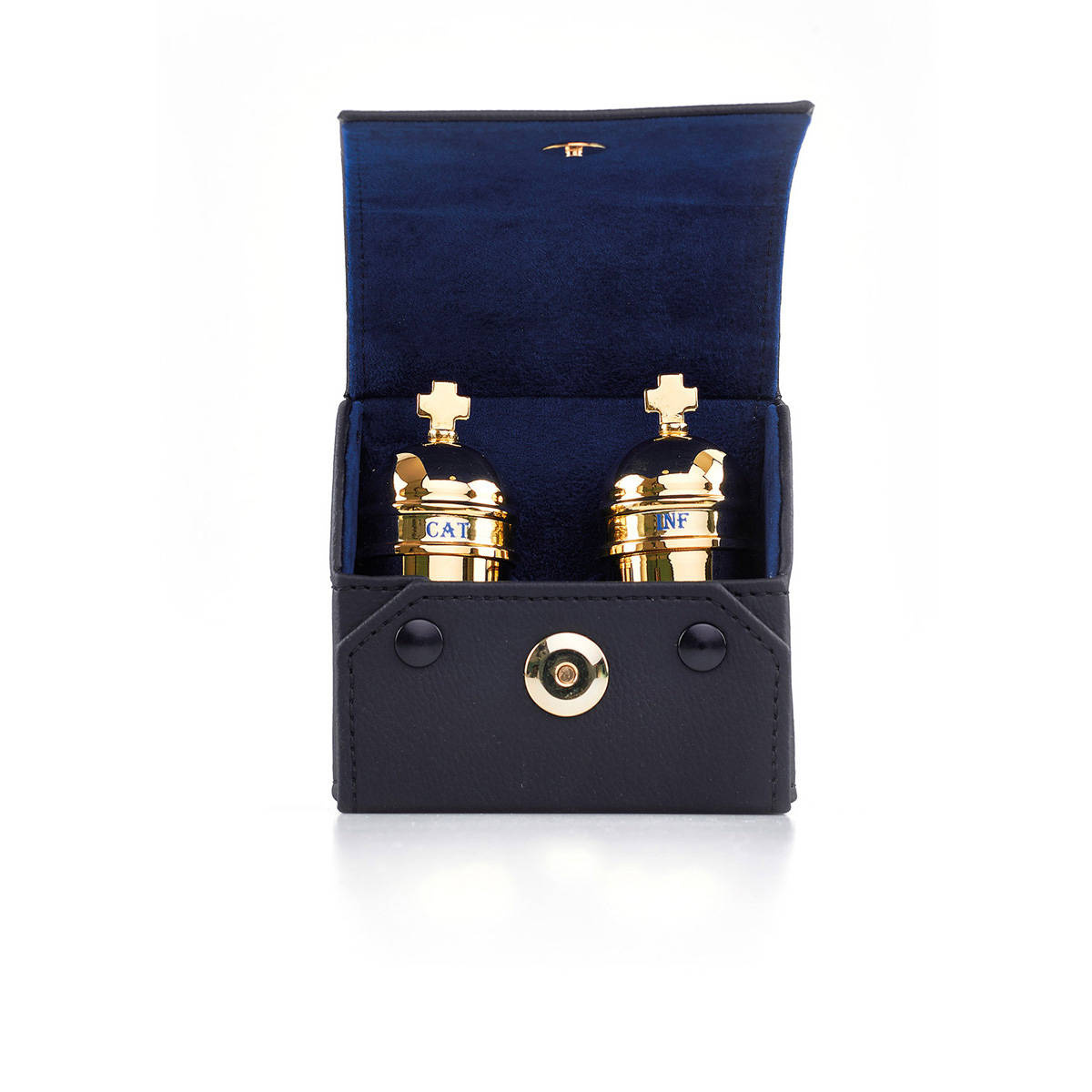 Zestaw podwójny pojemników na oleje– vintage, w etui skórzanym.
