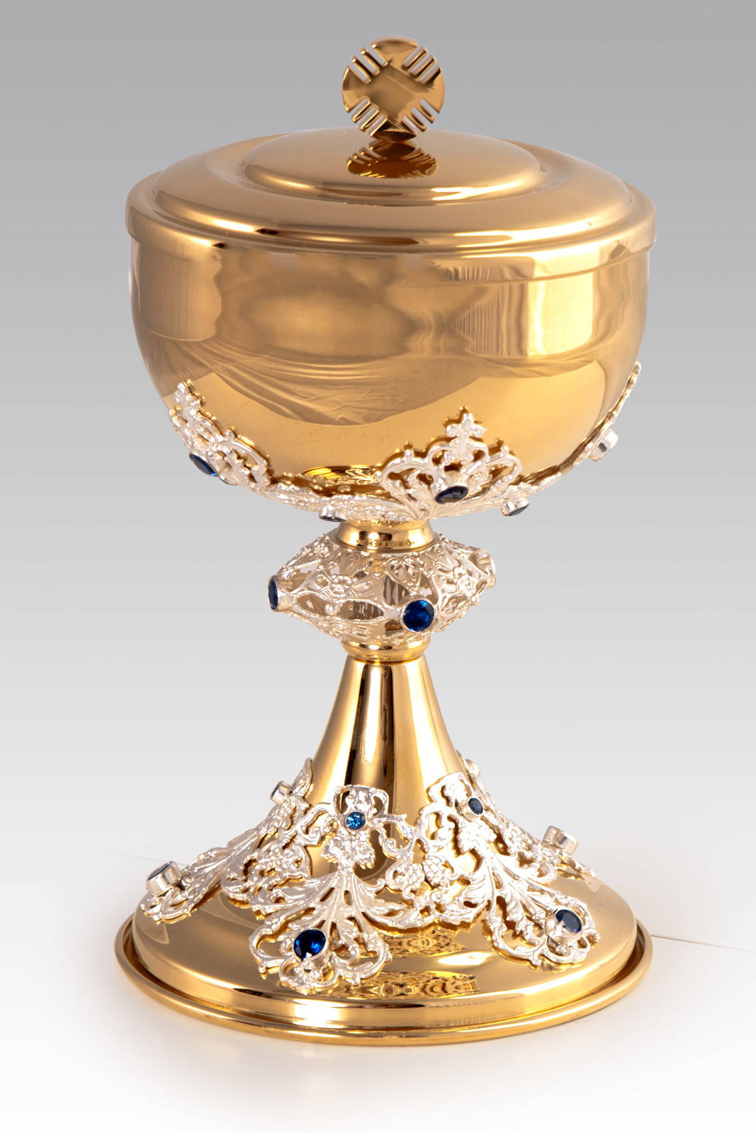 Puszka liturgiczna ze srebrnym nodusem bogato zdobiona szafirami. Puszka wykonana jest z najwyższej jakości materiałów szlachetnych, które gwarantują wysoką trwałość oraz odporność na korozję. Pozłacane wnętrze. puszki liturgicznej, spełnia wymagane standardy do przechowywania konsekrowanych komunikantów.