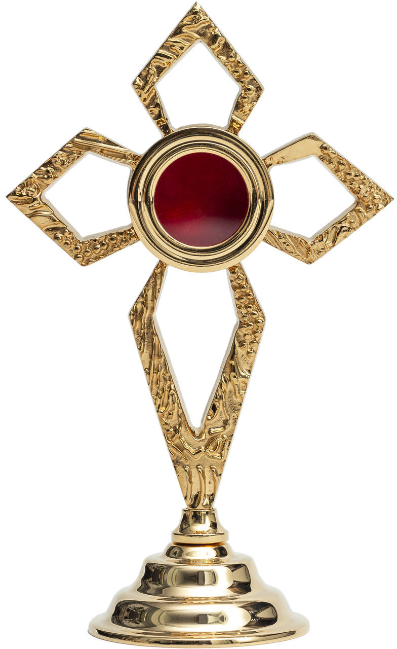 Relikwiarz mosiężny w kształcie krzyża złocony na jedną relikwię. Dostępny w trzech kolorach: złotym, srebrnym lub patynowane srebro. Relikwiarz został wykonany z bardzo dużą starannością. Zawiera liczne zdobienia i przetłoczenia, a także został poddany polerowaniu co nadaje mu dodatkowo blasku.