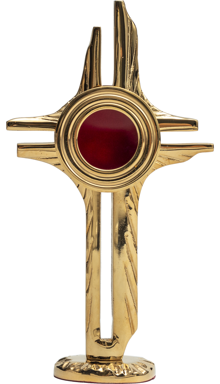 Relikwiarz mosiężny w kształcie krzyża złocony, na jedną relikwię. Dostępny w trzech kolorach: złotym, srebrnym lub patynowane srebro.