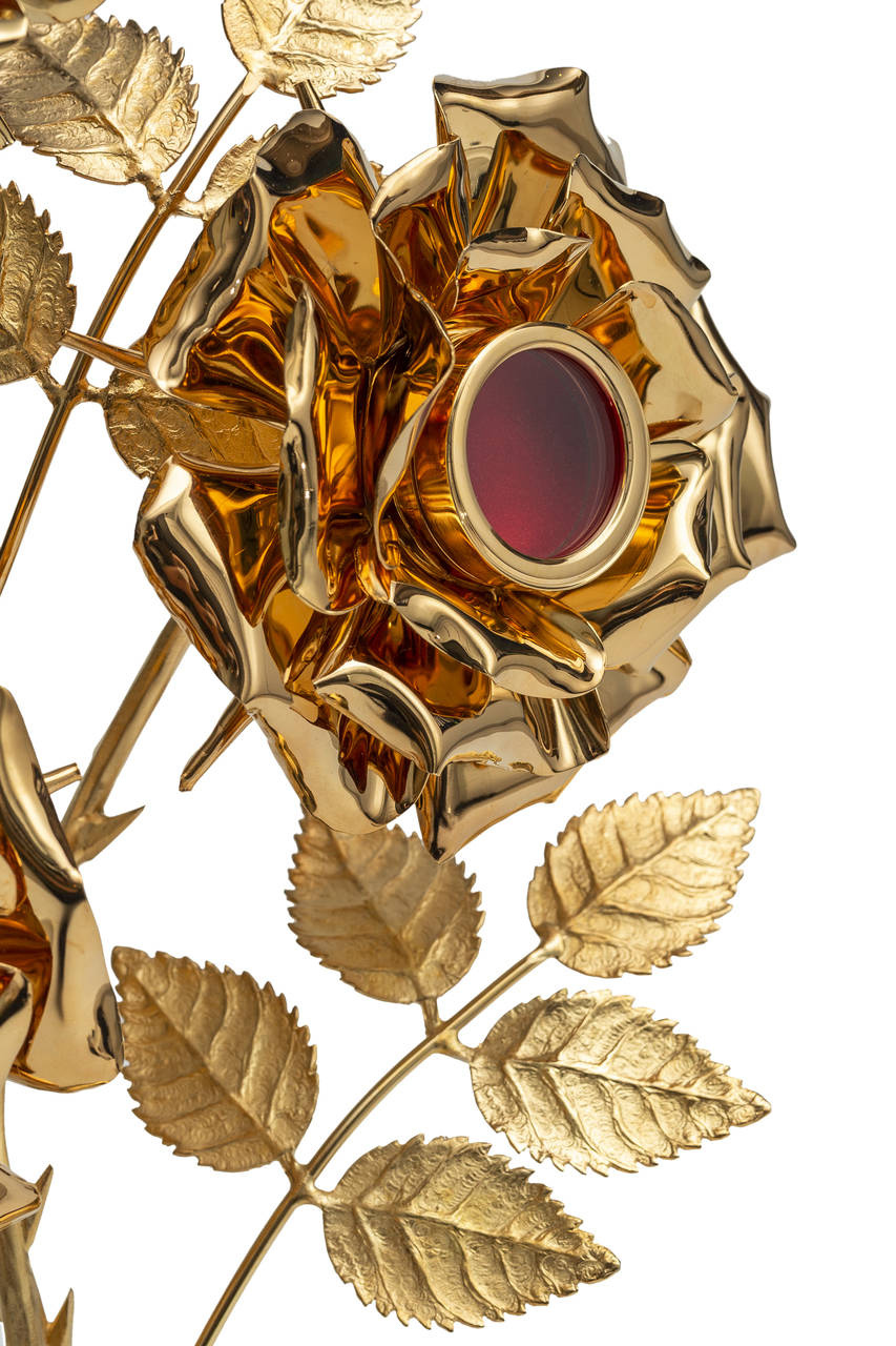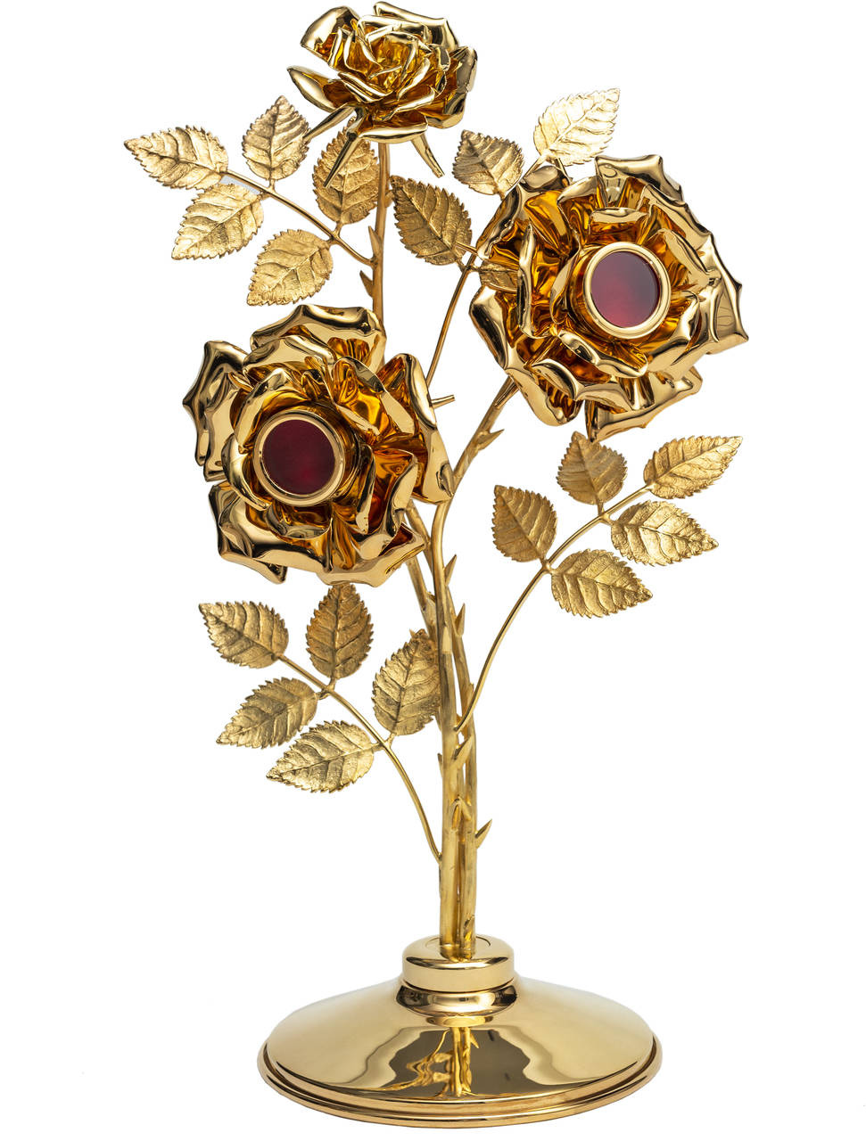 Relikwiarz mosiężny złocony w formie kwiatu róży na dwie relikwie o wysokości 42 cm