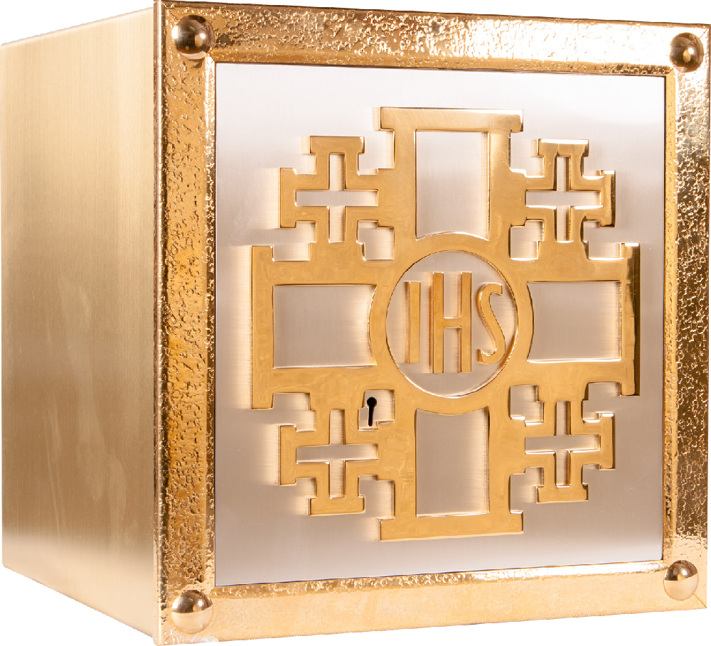 Istnieje możliwość wykonania każdego tabernakulum wg. wytycznych klienta. Standardowo tabernakulum występuje w 3 rozmiarach. Fotografia przedstawia tabernakulum w rozmiarze 30 cm. Dla pozostałych rozmiarów szerokość ramek dookoła drzwi nie ulega zmianie, a proporcje aplikacji zewnętrznej mogą się nieznacznie różnić).