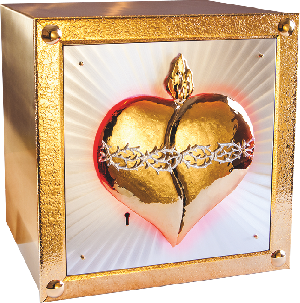 Istnieje możliwość wykonania każdego tabernakulum wg. wytycznych klienta. Standardowo tabernakulum występuje w 3 rozmiarach. Fotografia przedstawia tabernakulum w rozmiarze 30 cm. Dla pozostałych rozmiarów szerokość ramek dookoła drzwi nie ulega zmianie, a proporcje aplikacji zewnętrznej mogą się nieznacznie różnić).