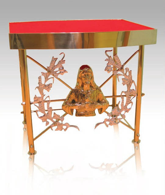 Podstawa pod monstrancję wykonana z polerowanego na wysoki połysk mosiądzu,bogato zdobiona, zabezpieczona specjalnym werniksem.Góra tronu oklejona ozdobnym czerwonym suknem.
