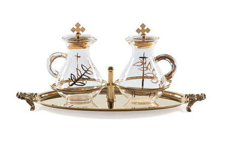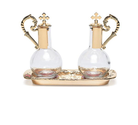 Ampułki na wodę i wino z tacą zdobione pozłacane