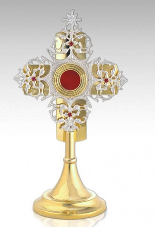 Okazały relikwiarz mosiężny w formie małej monstrancji zdobiony rubinami o wysokości 33 cm