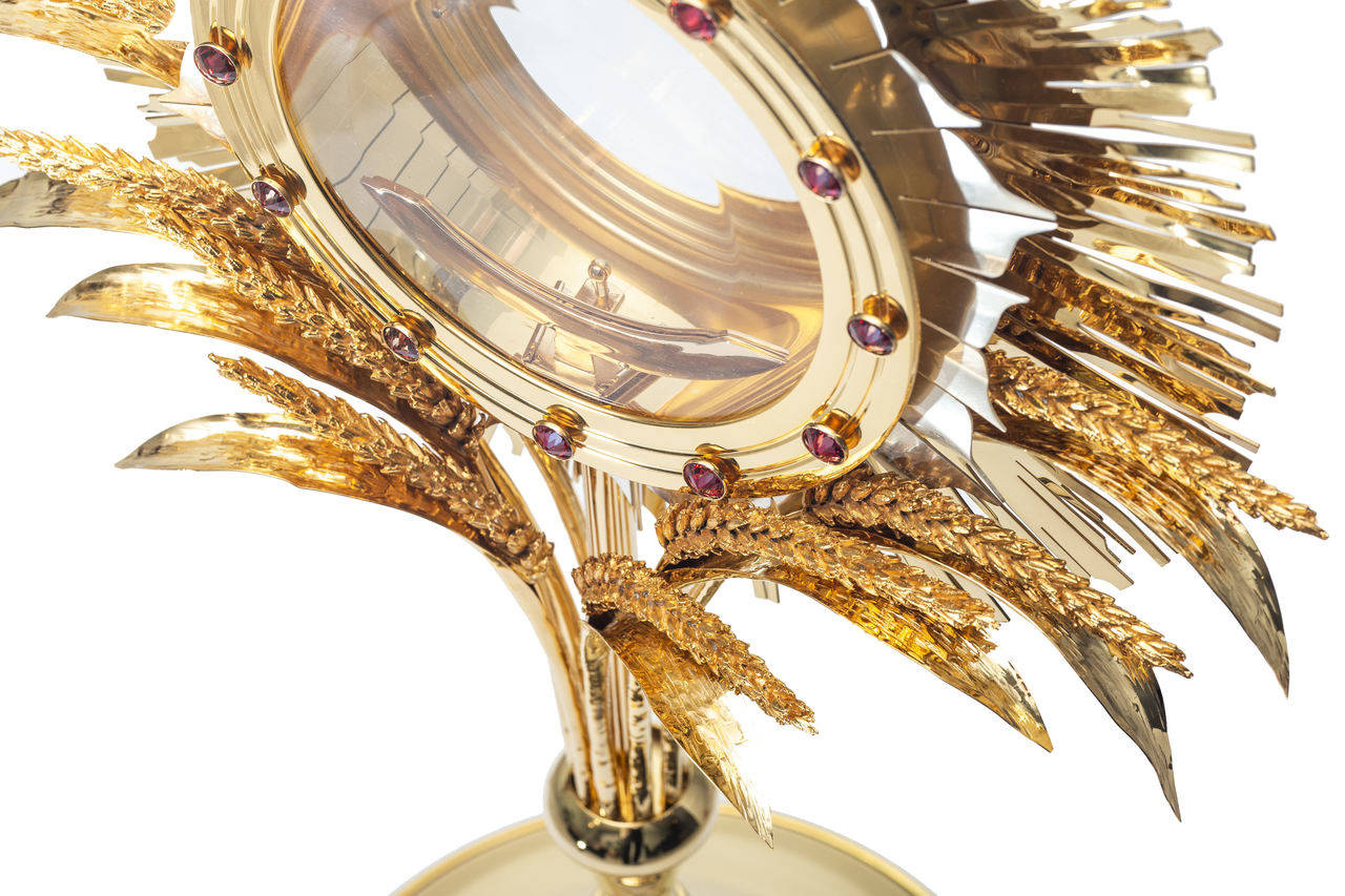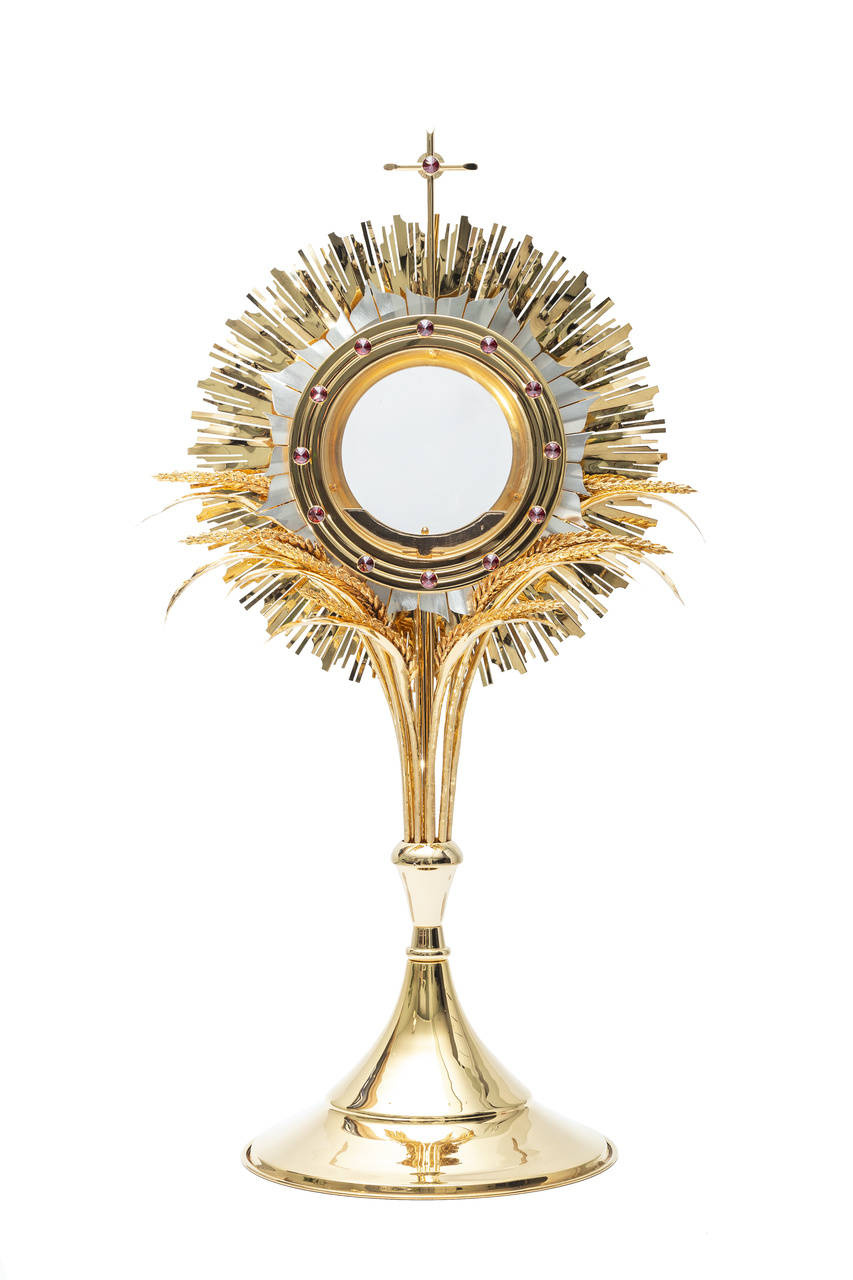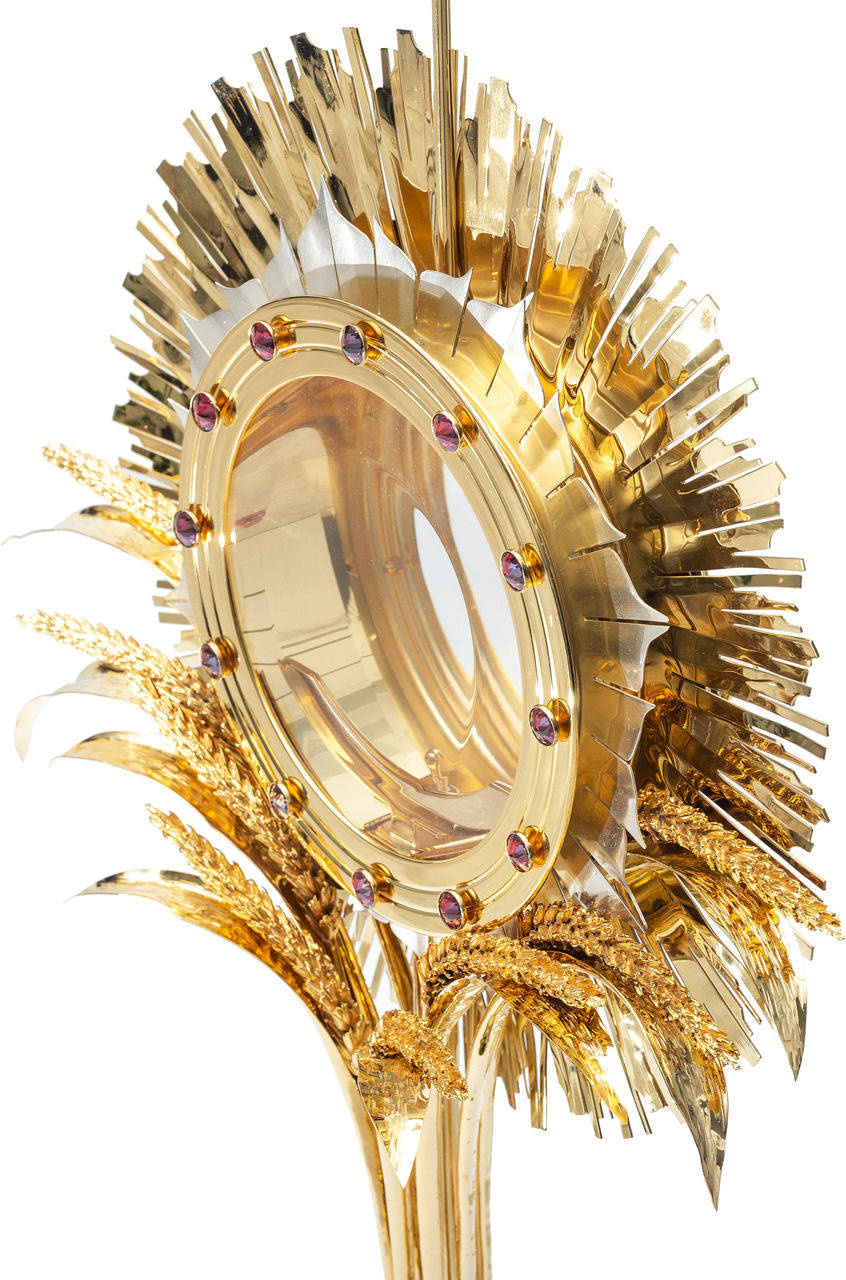 - Duża monstrancja, pozłacana , zdobiona kamieniami z odlewami kłosów zboża o wysokości 80 cm