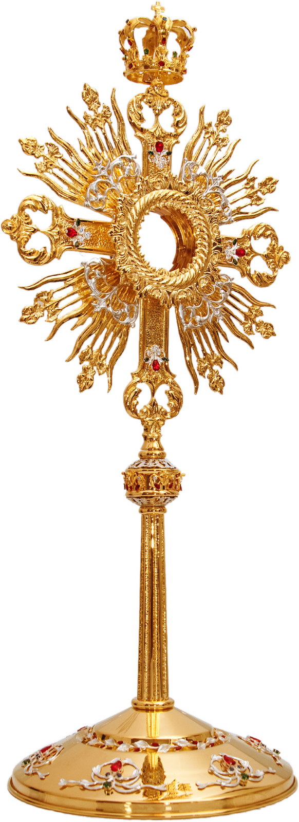 Duża monstrancja zdobiona kamieniami i mosiężnymi, złoconymi elementami. W zestawie Melchizedek. Zawiera liczne zdobienia i przetłoczenia, a także została poddana polerowaniu co nadaje jej dodatkowo blasku.