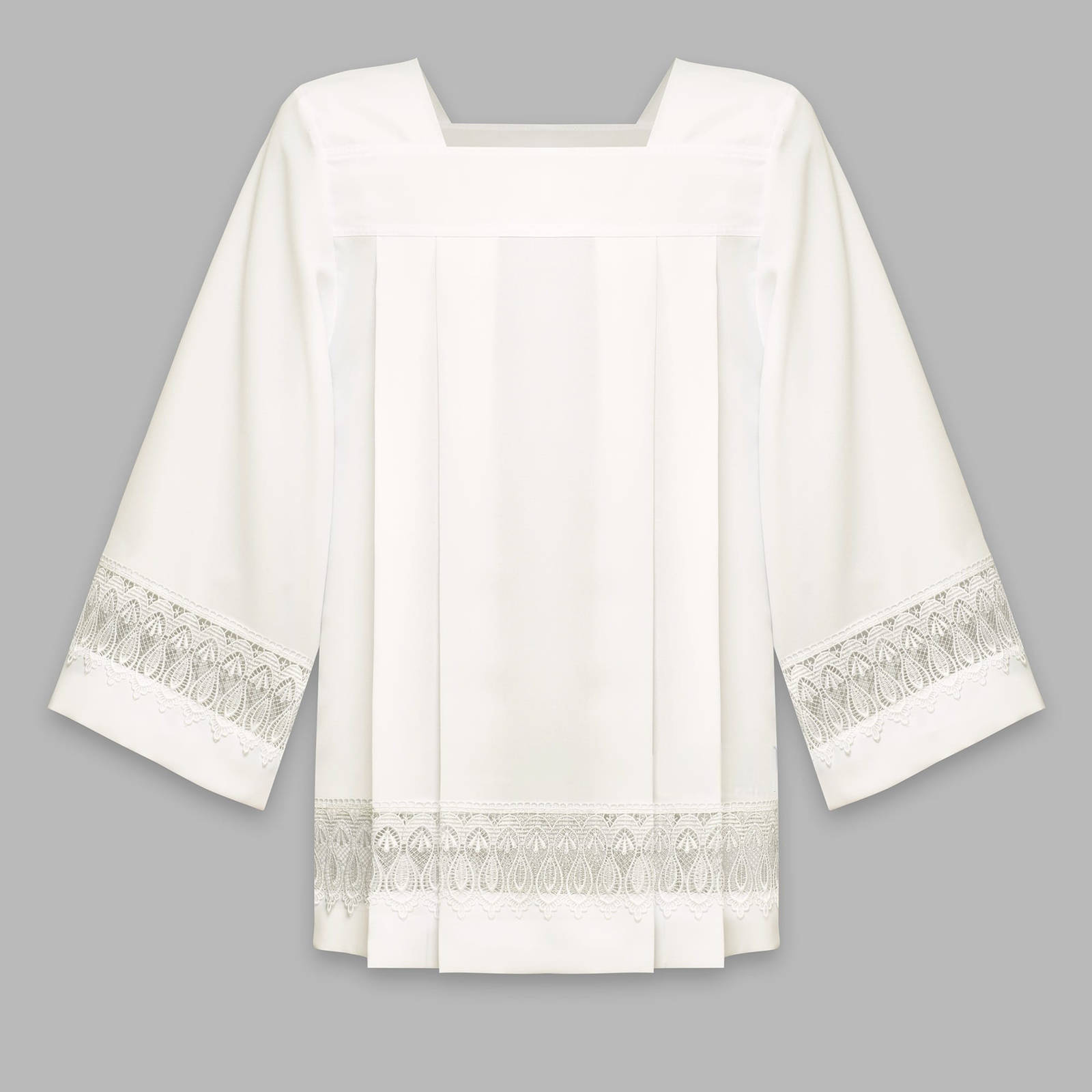 Komża w kolorze ecru, wykonana z żorżety z zakładkami z przodu i z tyłu, dzięki czemu bardzo dobrze się układa.