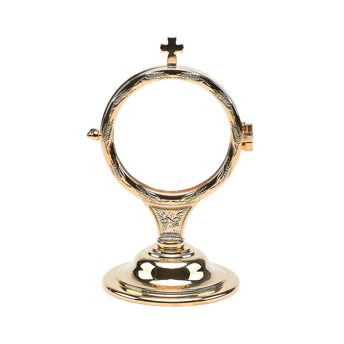 Wykonana z mosiądzu, na stopce, z ornamentem- złocona.