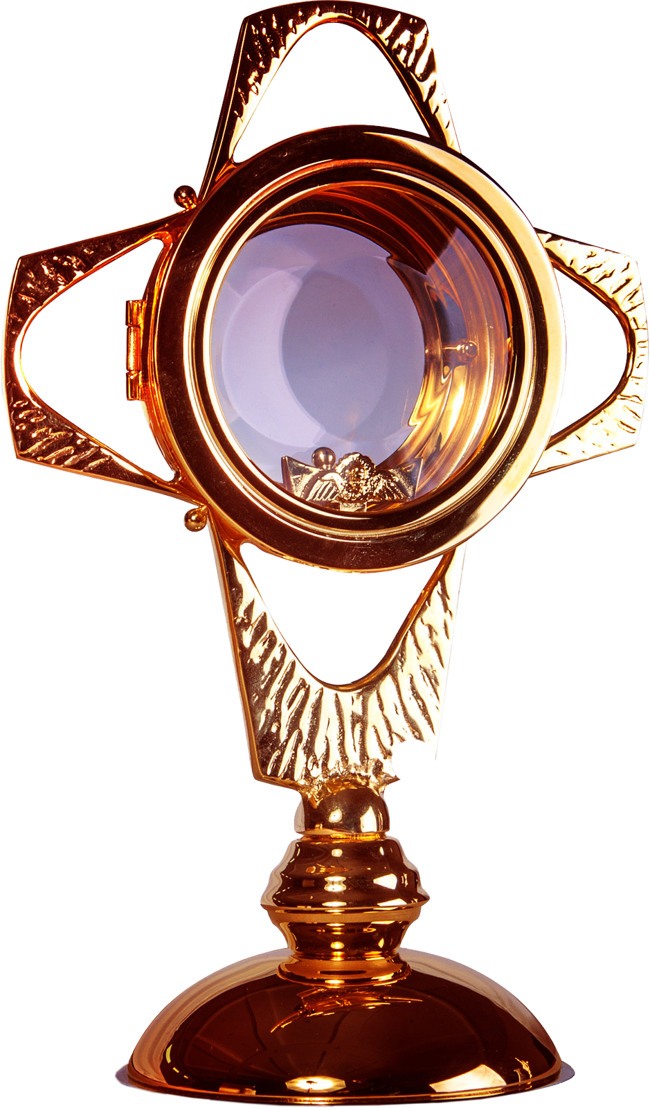Mała monstrancja złocona, zdobiona oryginalną metaloplastyką. W zestawie melchizedek, dedeykowana dla hostii o średnicy 7 cm. Monstrancja została wykonana z niezwykłą starannością. Zawiera liczne zdobienia i przetłoczenia, a także został poddana polerowaniu.