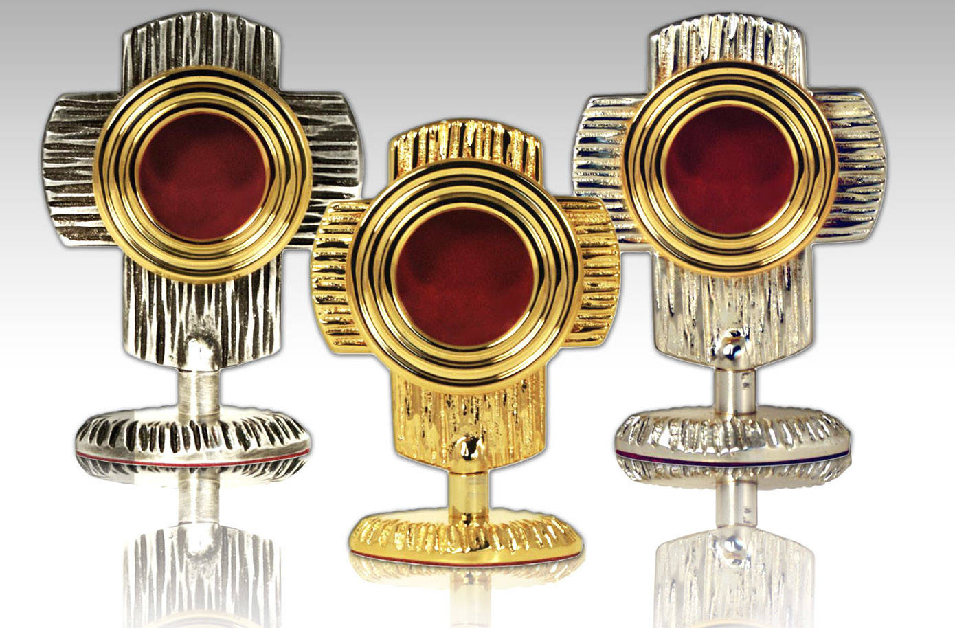 Mały relikwiarz mosiężny na jedną relikwię. Dostępny w trzech kolorach: złotym, srebrnym lub patynowanym.