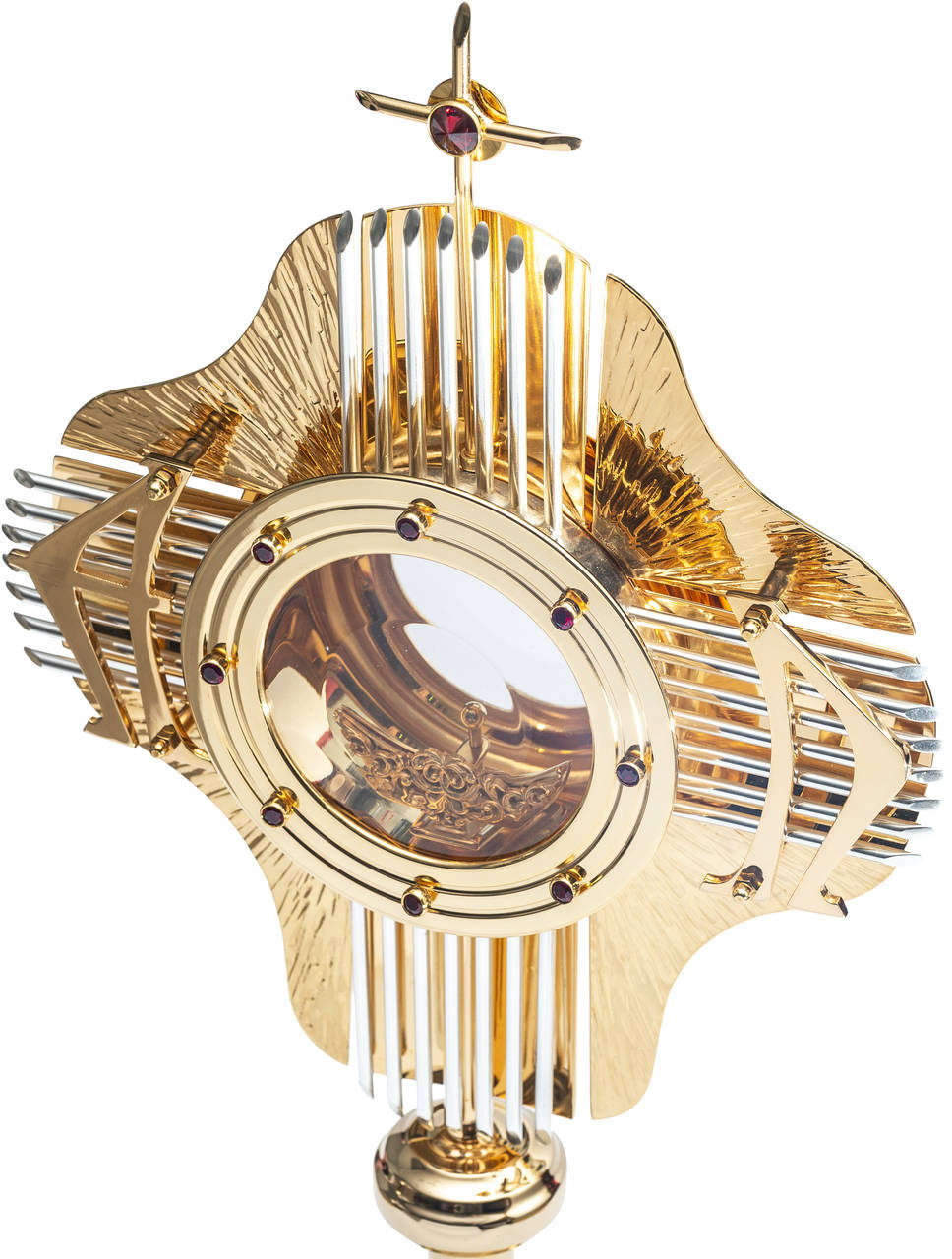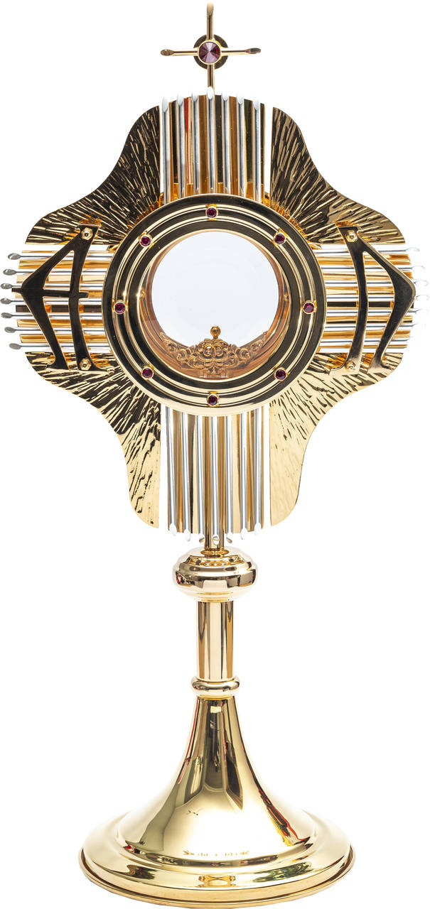 Monstrancja z motywem Alfy i Omegi, pierścień upiększony czerwonymi kamieniami, złocona.Melchizedek w komplecie, dedykowana do hostii o średnicy 7 cm. Dostępna w dwóch wersjach: złocona lub srebrzona.Monstrancja została wykonana z niezwykłą dokładnością, zawiera liczne zdobienia i przetłoczenia, a także została poddana polerowaniu.Możliwość zamówienia z futerałem.