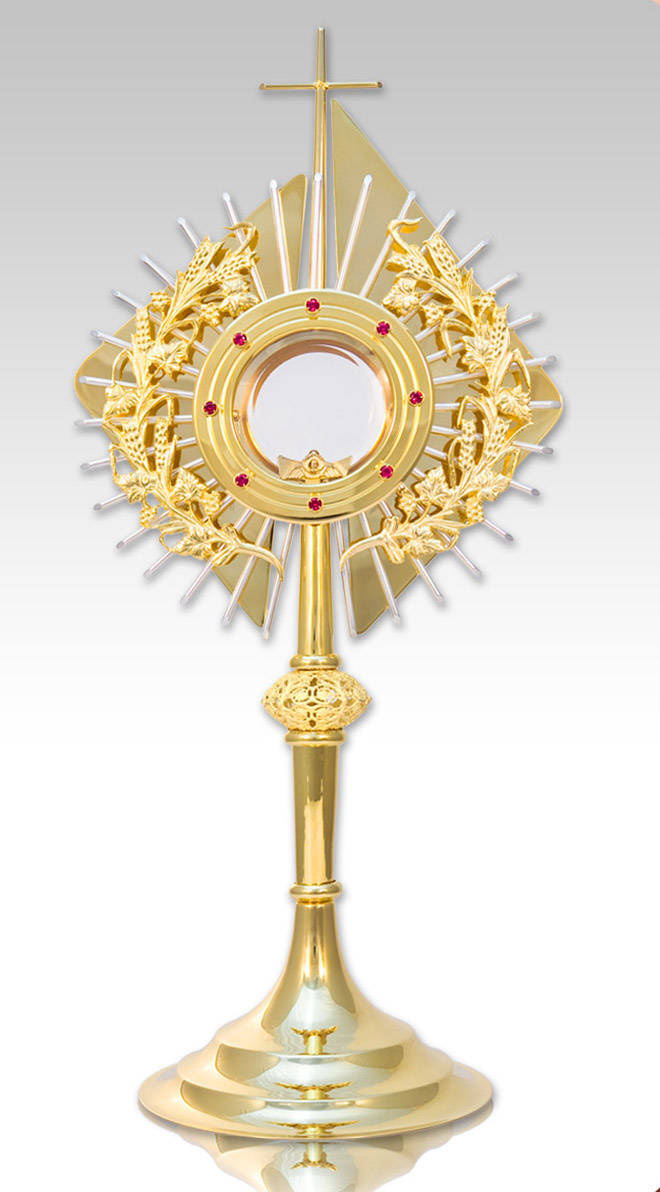 Monstrancja z motywem kłosów na tle srebrzonych promieni symbolizujących królestwo Boże. Dostępna w dwóch wersjach- złocona lub srebrzona. Zdobiona kamieniami i mosiężnymi, złoconymi elementami. Melchizedek w komplecie, monstrancja dedykowana jest do hostii o średnicy 7 cm
