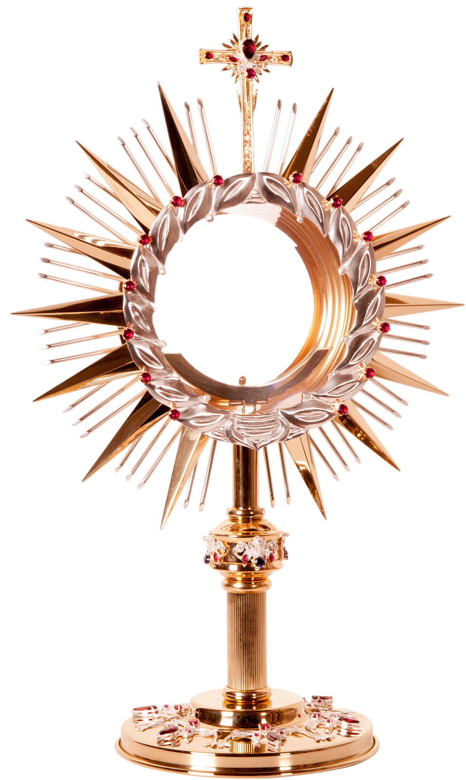 - Monstrancja złocona, bogato zdobiona kamieniami, na dużą hostię, wysokość 60 cm