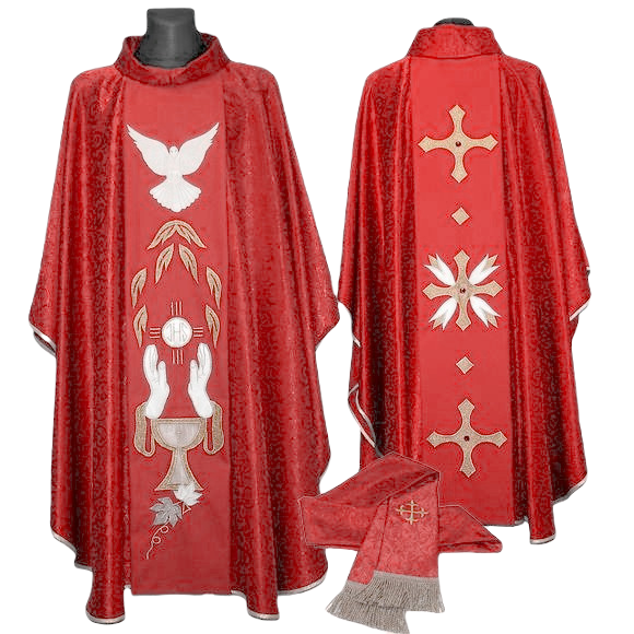 Ornat czerwony z tkaniny żakardowej, obszyty złotą lamówką, kołnierz typu golf. Pas zdobiony aplikacją i haftem maszynowym z tkaniny typu elana, luźno wszyty w podkrój szaty. W komplecie stuła w całości uszyta z tej samej tkaniny co ornat, o długości 125 cm. z wyhaftowanym krzyżem, obszyta złotymi, grubymi frędzlami. Długość ornatu 125 cm. Szerokość ornatu 160 cm. Prać chemicznie.