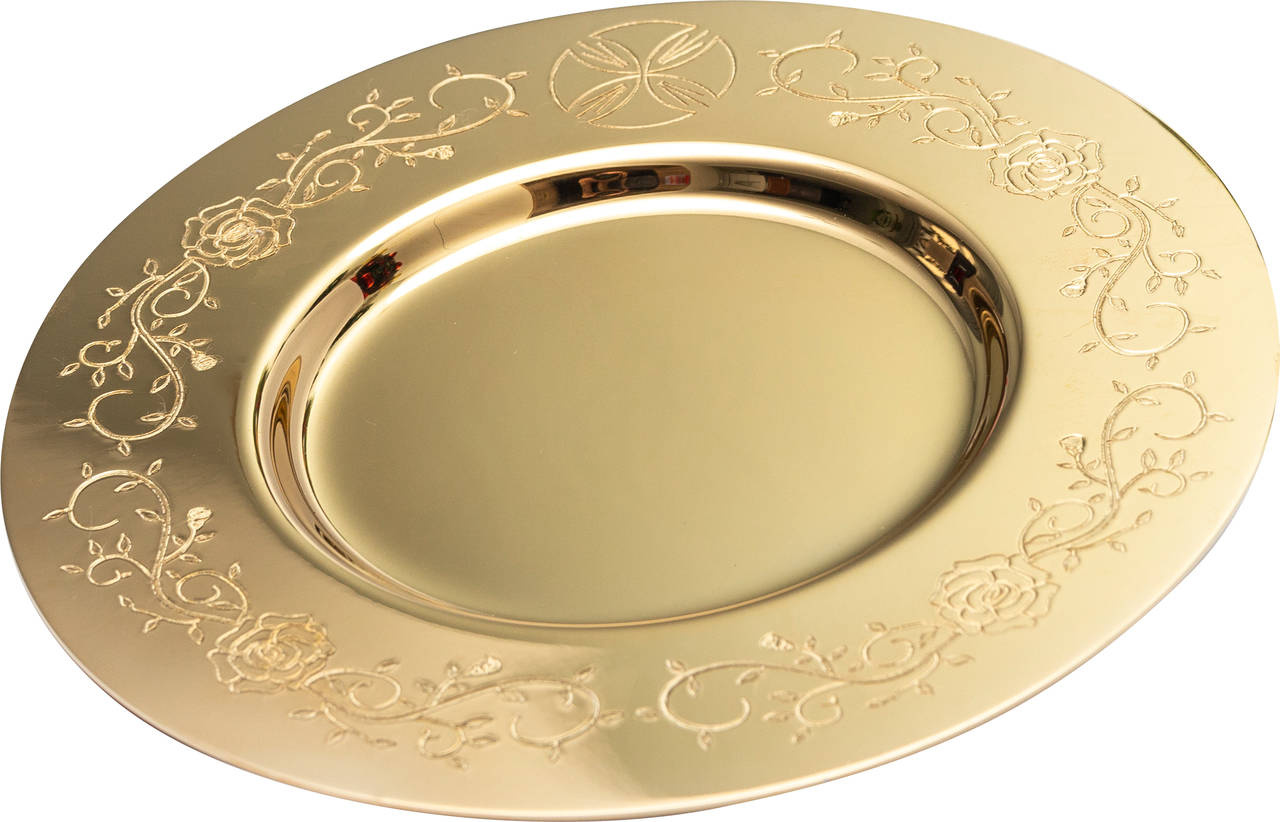 Patena kielichowa z przetłoczeniem na czasze. rączką wykonana polerowanego mosiądzu, grawerowana. Powierzchnia pateny jest złocona, co nadaje jej dodatkowo blasku.