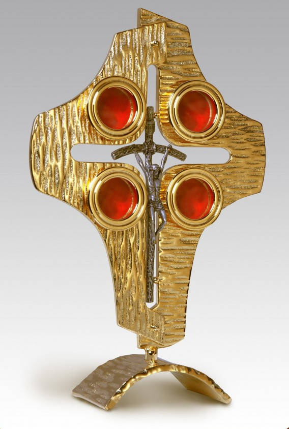 • Relikwiarz mosiężny złocony na cztery relikwie o wysokości 30 cm