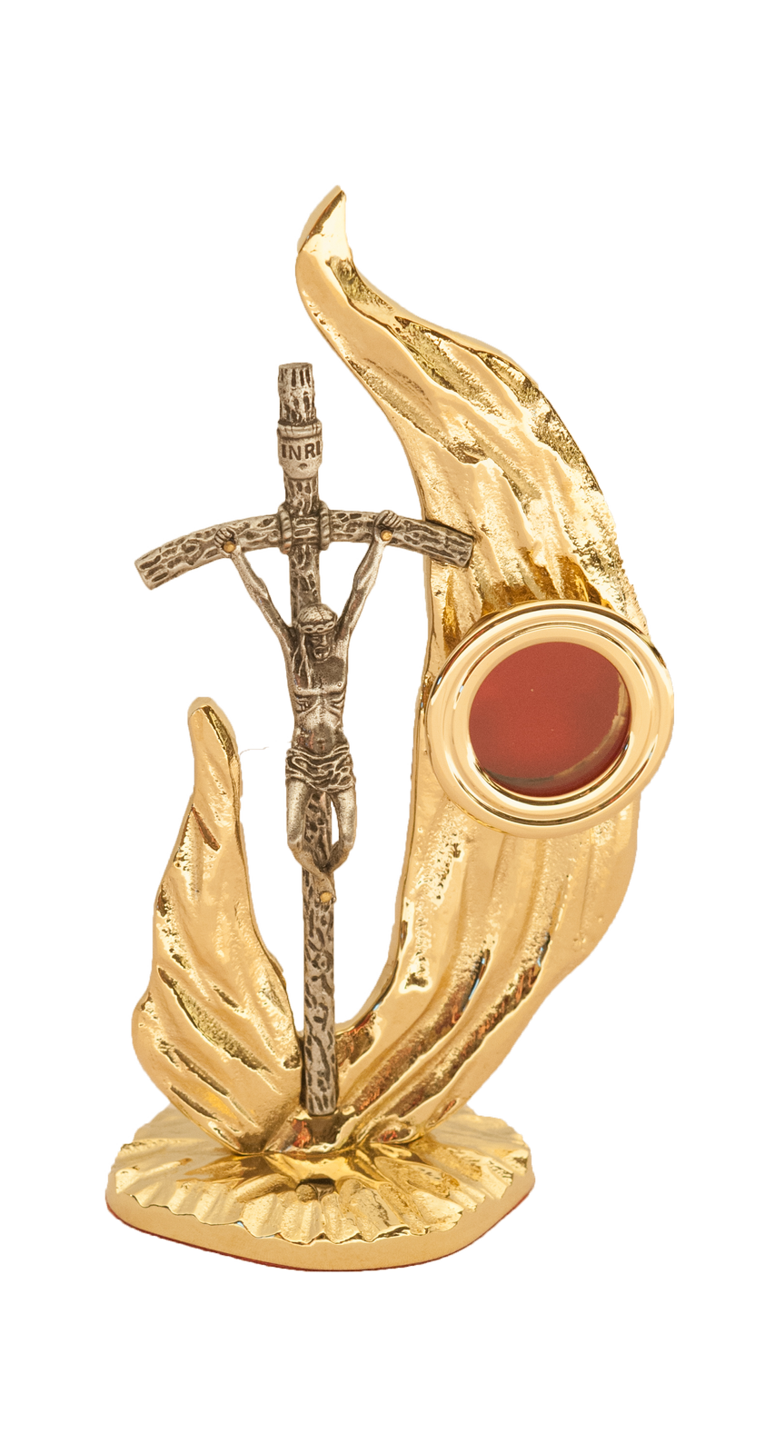 • Relikwiarz mosiężny złocony z krzyżem papieskim z podwójnym płomieniem,na jedną relikwię o wysokości 20 cm