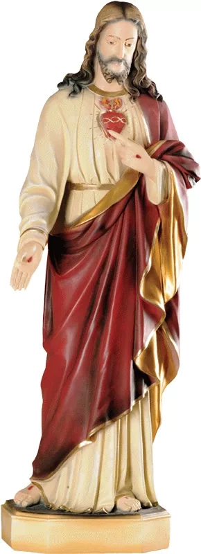 Wysokiej jakości figura Serce Pana Jezusa o wysokości 99 cm wykonana jest z trwałej żywicy syntetycznej wzmocnionej włóknem szklanym oraz pomalowana wysokiej jakości farbami odpornymi na ścieranie.